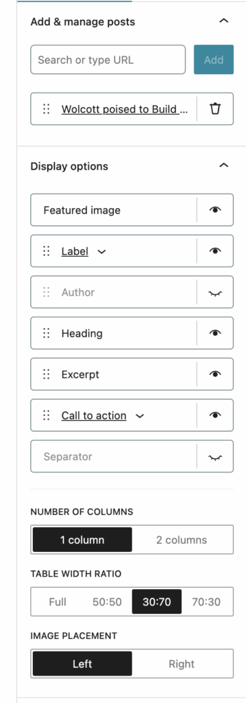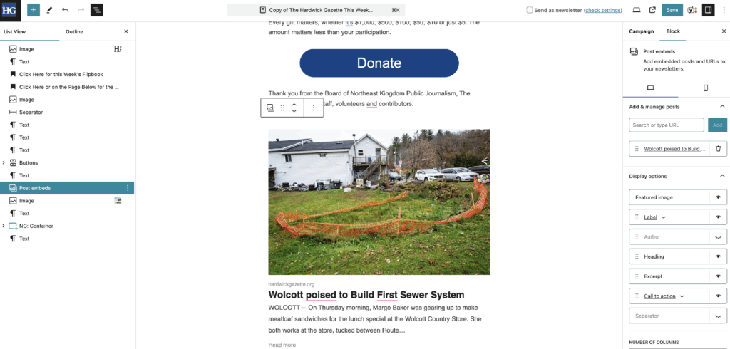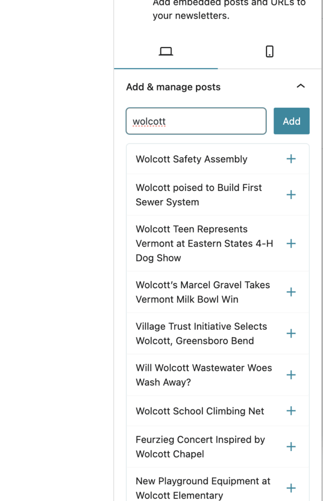 Select the desired post. This will bring the story into your newsletter where you can format and adjust as needed from the block settings.