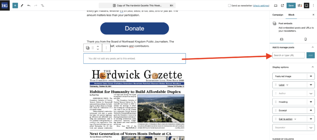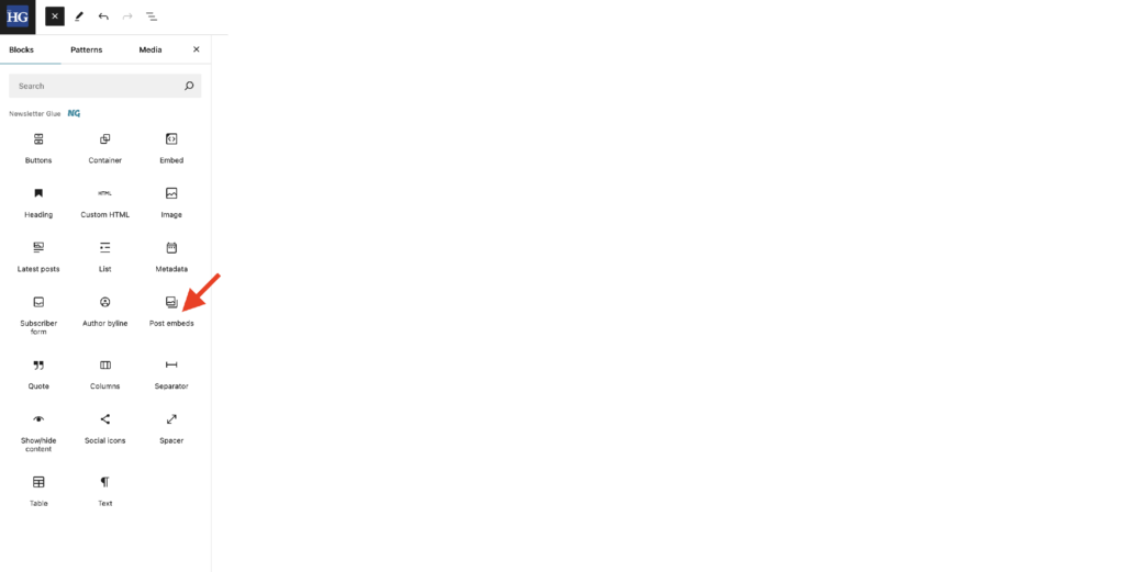 Select “Post embeds” by clicking and dragging the block to the right inside your newsletter campaign.