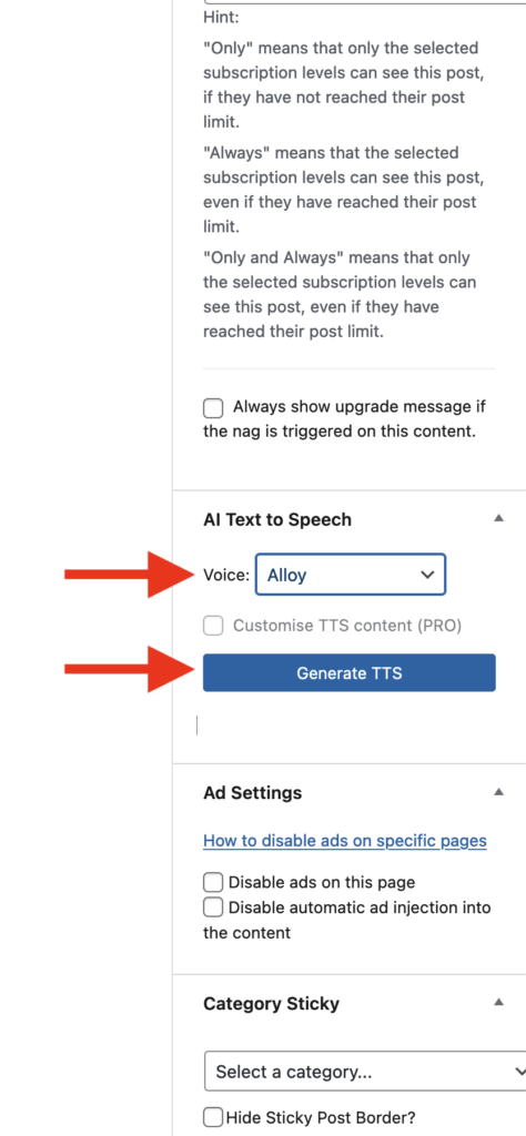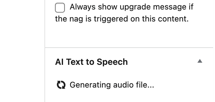 - Once a post is published, find the “AI Text to Speech” option within the right-hand side bar while editing a post.