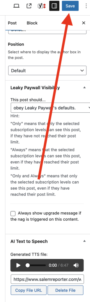 Once complete, the audio player will show on the side bar at which point you’ll “Save” the post. Once saved, the audio will appear at the top of this particular post for your readers.