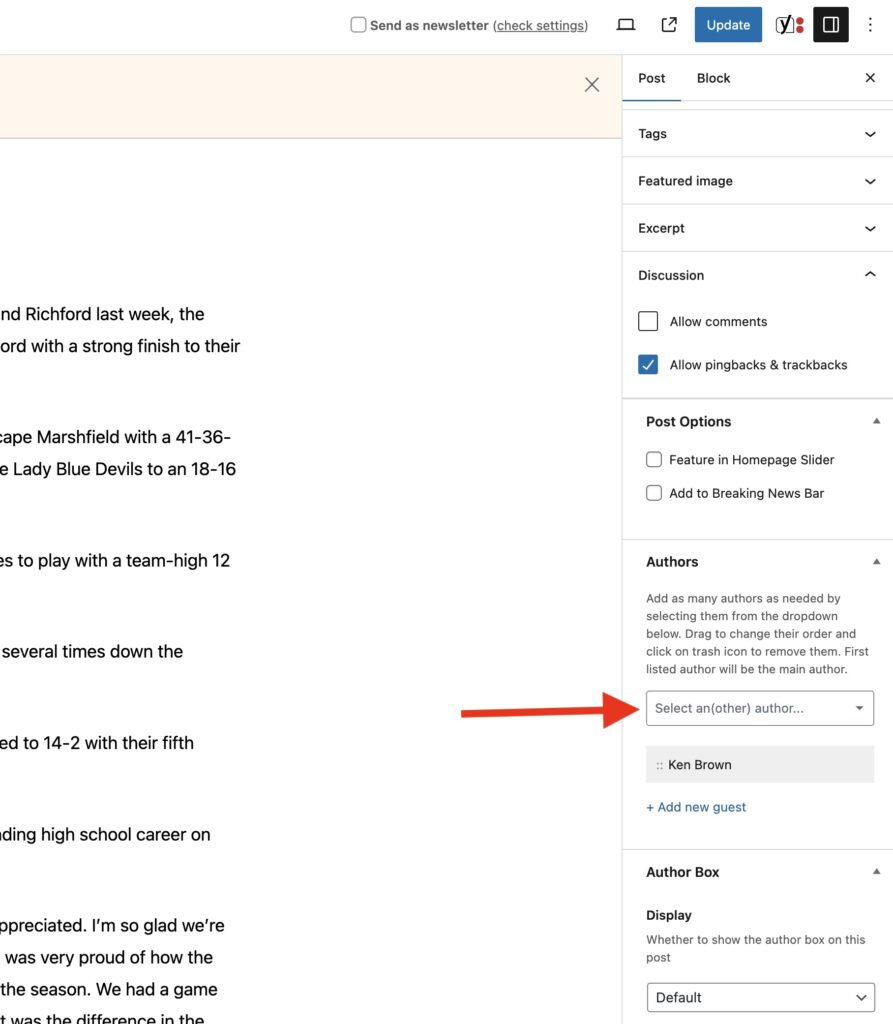 How to add multiple authors to a single post Install this plugin. While inside a post, find the “Authors” panel on the right. Select an existing user/author you’d like to add to the post. Update/Publish the post Screenshot Updated on November 22, 2025 Was this article helpful? Yes No Get more helpCan't find the answer you're looking for? Get in touch.Contact support