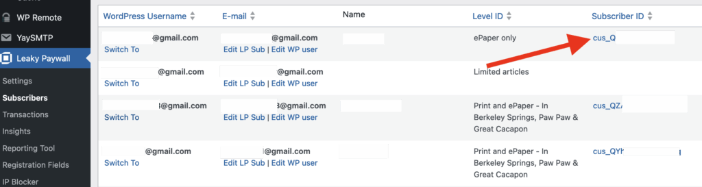 Go to Leaky Paywall -> Subscribers and find the user you would like to cancel. Select the Subscriber ID link.