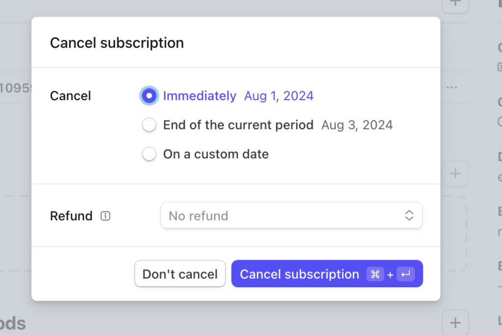 Cancel the subscription “Immediately”. The subscriber will continue to have access until the end of their current period.