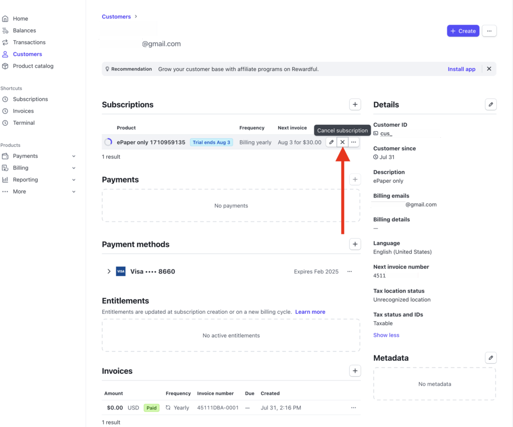 Select the “X” icon for the subscription you’d like to cancel.