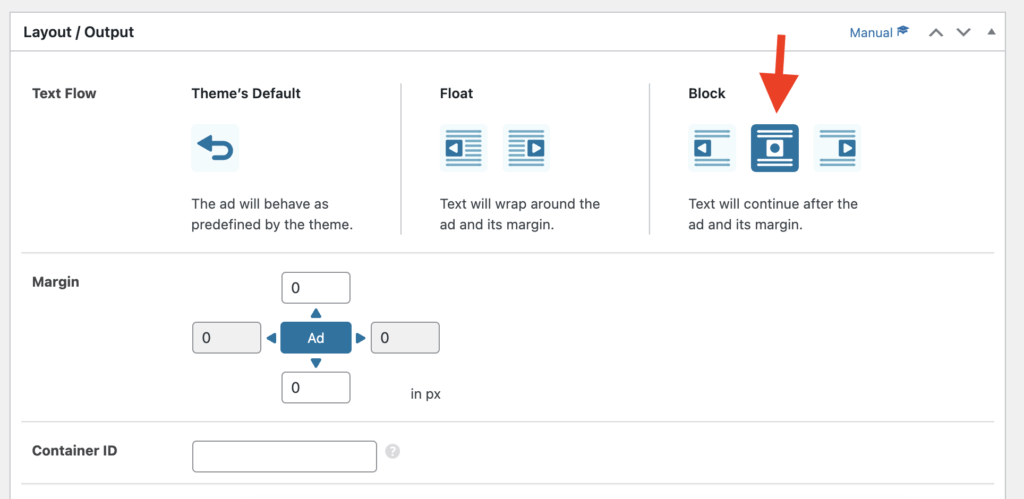 How to center an ad in WP Advanced Ads While placing the ad, scroll to “Layout / Output” and select the center block icon as shown below. Updated on November 22, 2025 Was this article helpful? Yes No Get more helpCan't find the answer you're looking for? Get in touch.Contact support