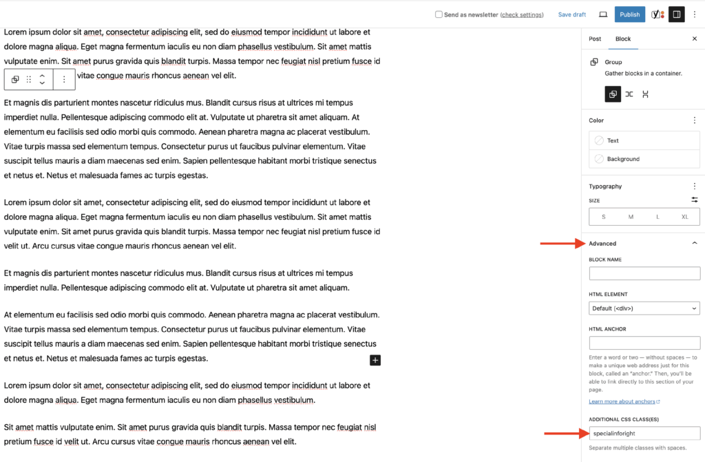 - Under “Additional CSS CLASS(ES)” add in specialinforight or specialinfoleft.