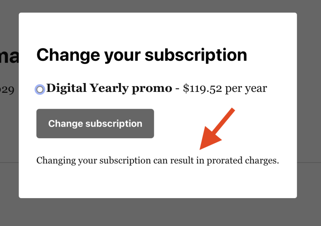 Additionally, you may want to remove the proration language within Leaky Paywall’s “Change Subscription” window.