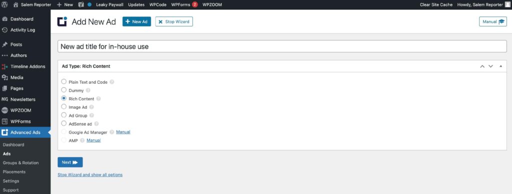 Create a name for the ad. This is only displayed on the backend for internal use. Select “Rich Content”.