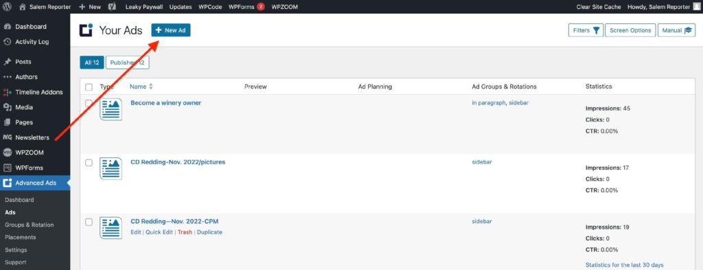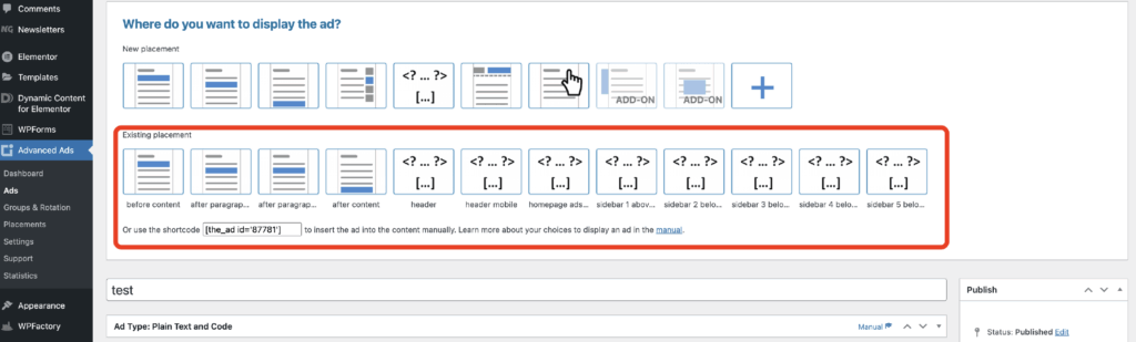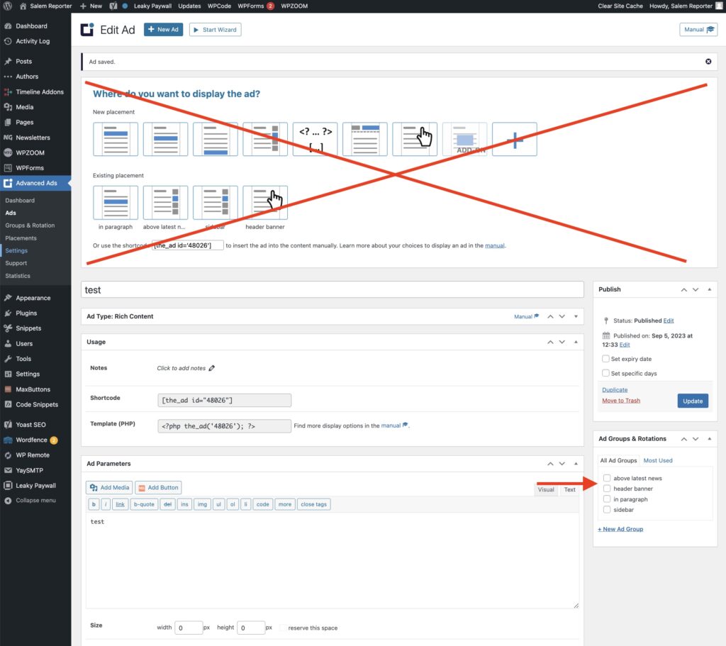 If your site does not use “Ad Groups & Rotations”, select from an existing placement at the top. Placements will not rotate.