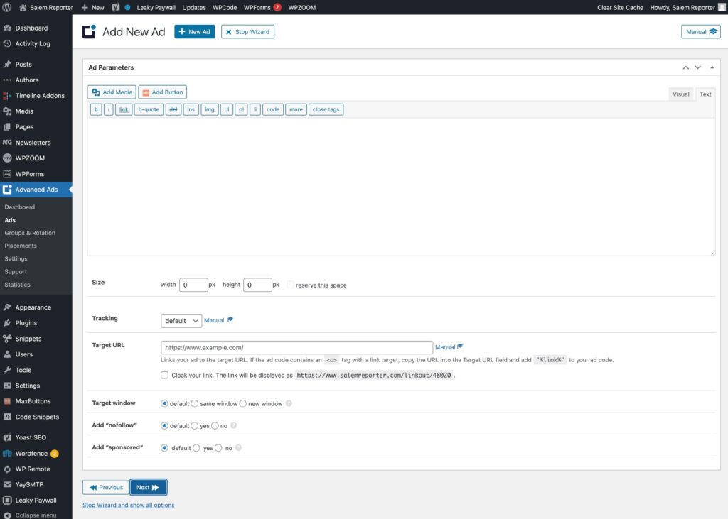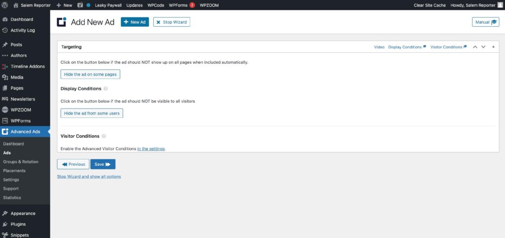If you want to make the ad only visible to specific pages or categories, you can adjust the Targeting and Display Conditions.