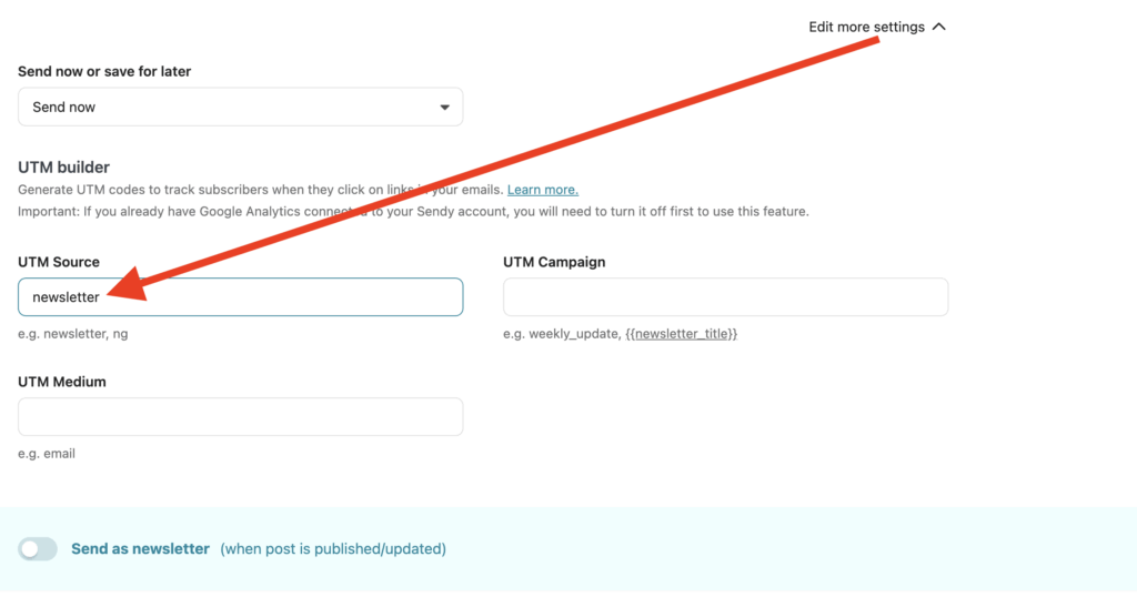 At the bottom of the newsletter in Newsletter Glue, select “Edit more settings” and add “newsletter” under the UTM source.