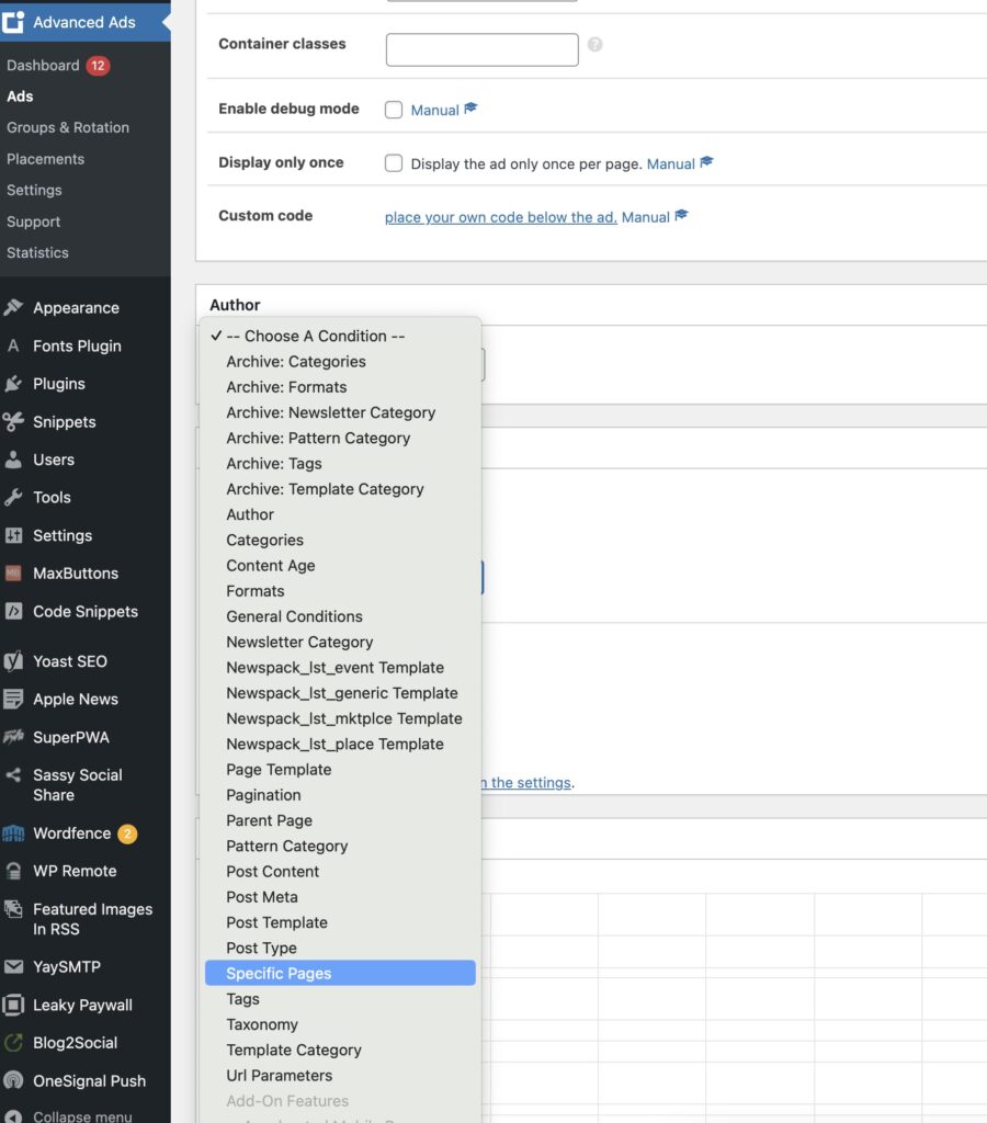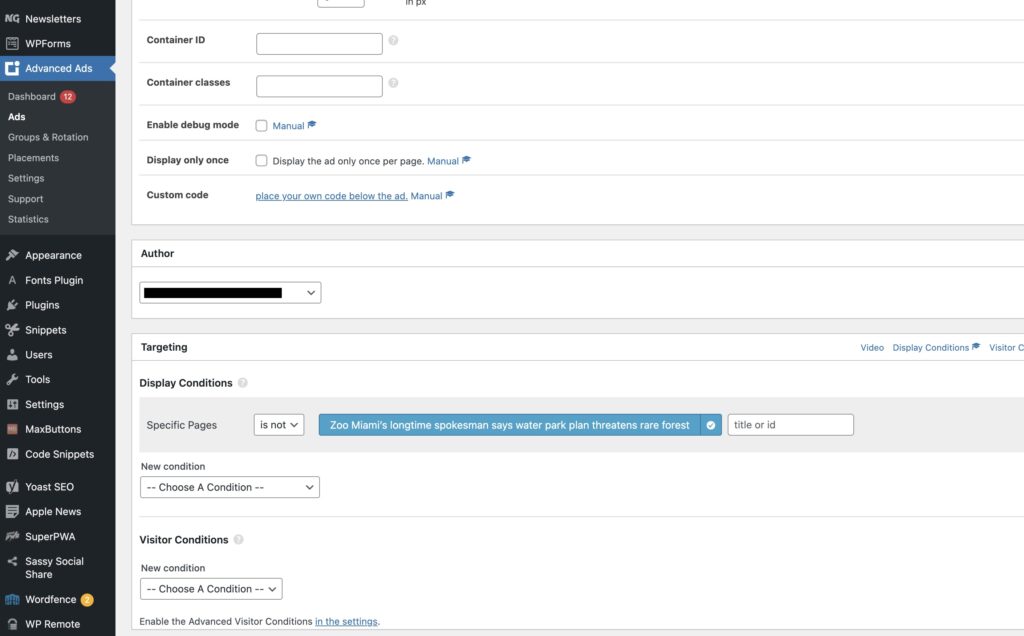 Enter the name of the post or page you’d like the ad to NOT display on. With the condition below, if the page/post is not “Zoo Miami’s longtime spokesman says water park plan threatens rare forest”, the ad will show.